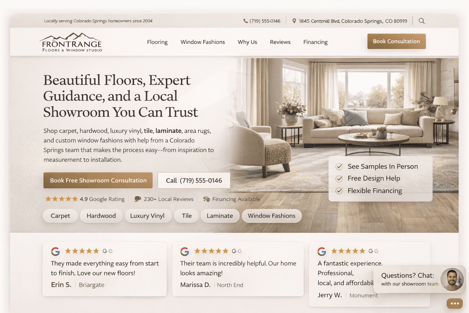 Homeowners researching flooring projects often compare several companies before deciding who to contact. If a website doesn’t clearly show past work, explain flooring options, or appear in Google searches, potential customers quickly move on. This concept shows how a flooring company can present its work more effectively online while improving visibility and engagement through modern design, SEO, and AI-powered customer interaction.
